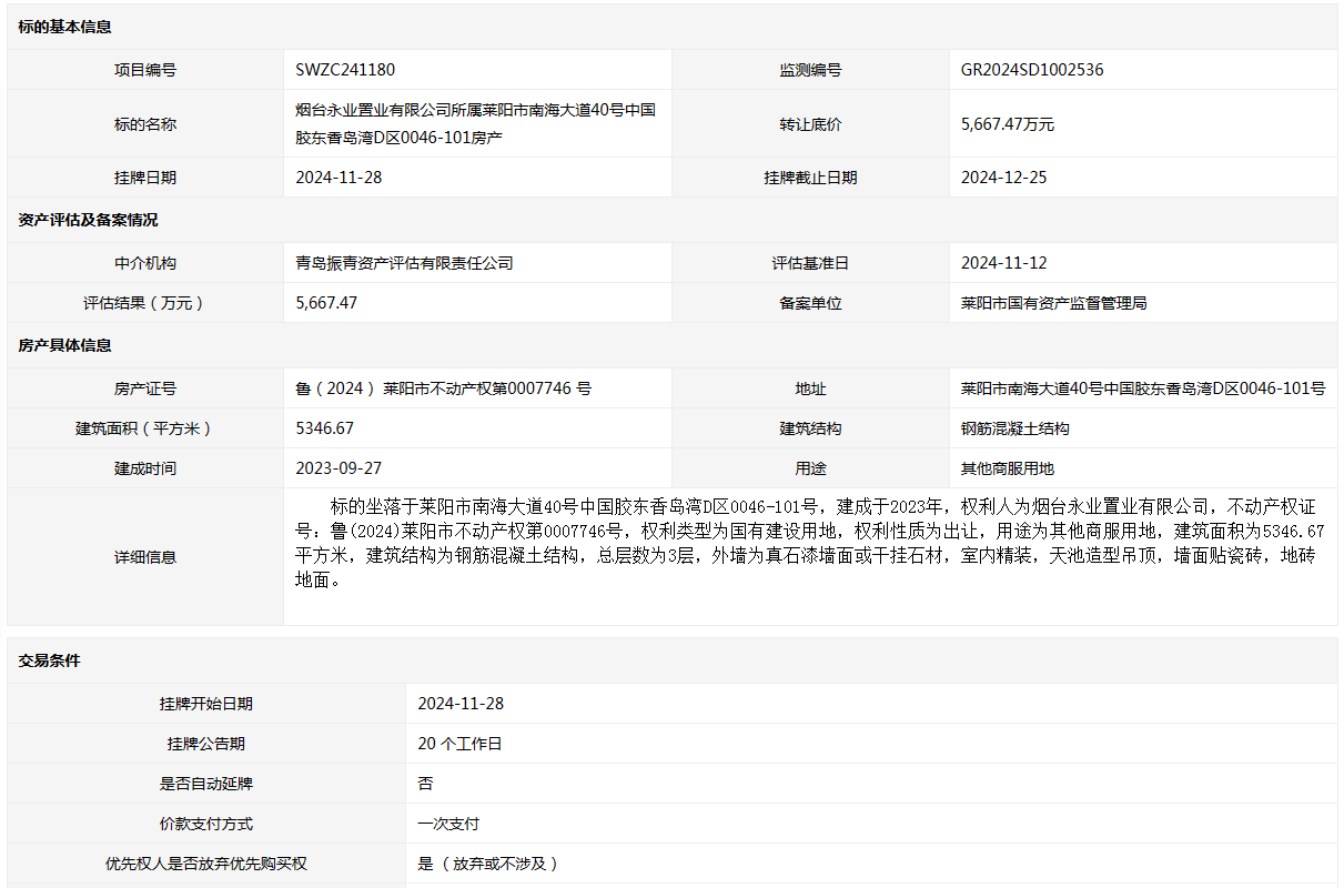 轉(zhuǎn)讓方:煙臺永業(yè)置業(yè)有限公司