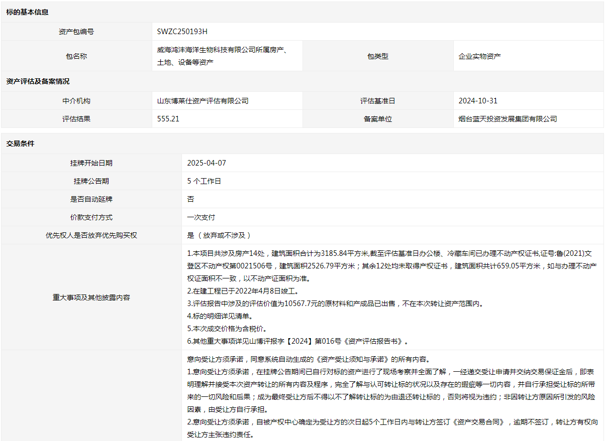 威海鴻灃海洋生物科技有限公司所屬房產(chǎn)、土地、設備等資產(chǎn)