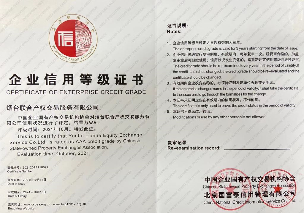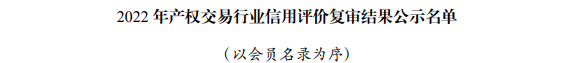 2022年產(chǎn)權(quán)交易行業(yè)信用評價復(fù)審結(jié)果在全國行業(yè)信用公共服務(wù)平臺和中國產(chǎn)權(quán)網(wǎng)進行公示,煙臺聯(lián)合產(chǎn)權(quán)在協(xié)會信用評價復(fù)審中,繼續(xù)維持AAA級評定不變。